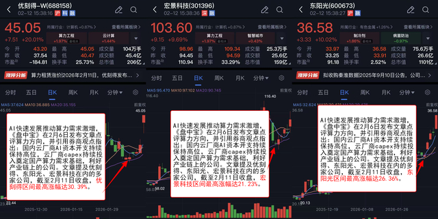 AI快速发展推动算力需求激增,《盘中宝》在2月6日发布文章点评算力方向,并引用券商观点指出:国内云厂商AI资本开支持续保持高位,云厂商capex持续投入奠定国产算力需求基础,利好产业链上的公司。文章提及优刻得、东阳光、宏景科技在内的多家公司,截至2月11日收盘,优刻得区间最高涨幅达30.39%,东阳光区间最高涨幅达26.36%,宏景科技区间最高涨幅达21.23%。