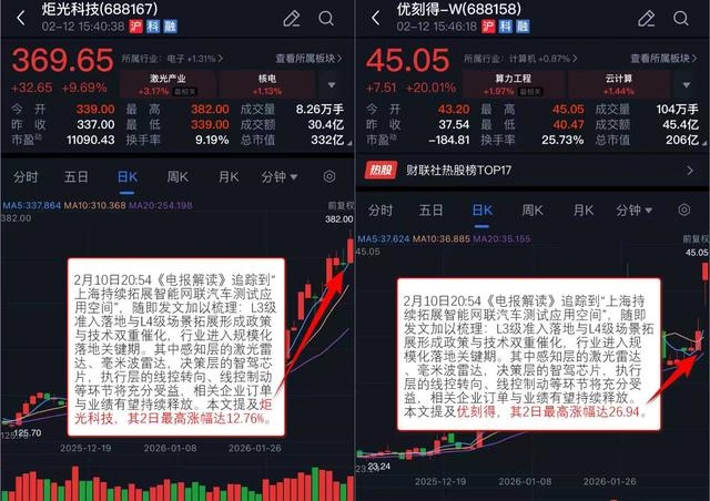 2月10日20:54《电报解读》 追踪到“上海持续拓展智能网联汽车测试应用空间”,随即发文加以梳理:L3级准入落地与L4级场景拓展形成政策与技术双重催化,行业进入规模化落地关键期。其中感知层的激光雷达、毫米波雷达,决策层的智驾芯片,执行层的线控转向、线控制动等环节将充分受益,相关企业订单与业绩有望持续释放。本文提及优刻得、炬光科技,其2日最高涨幅分别达26.94%、12.76%。