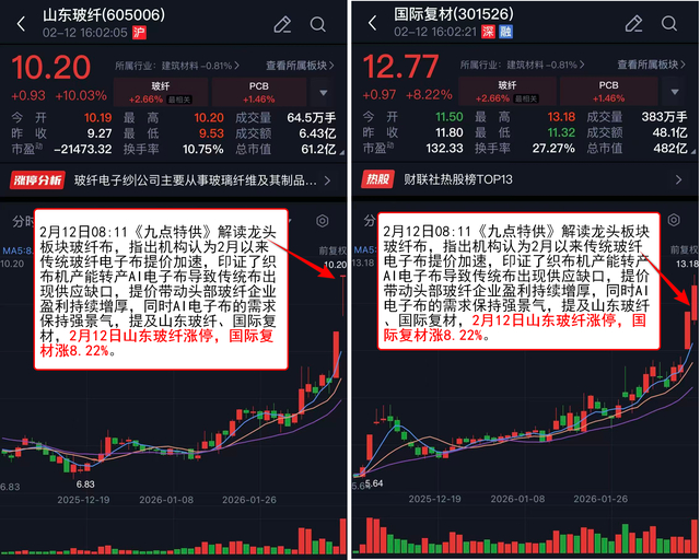 2月12日08:11《九点特供》 解读龙头板块玻纤布,指出机构认为2月以来传统玻纤电子布提价加速,印证了织布机产能转产AI电子布导致传统布出现供应缺口,提价带动头部玻纤企业盈利持续增厚,同时AI电子布的需求保持强景气,提及山东玻纤、国际复材,2月12日山东玻纤涨停,国际复材涨8.22%。