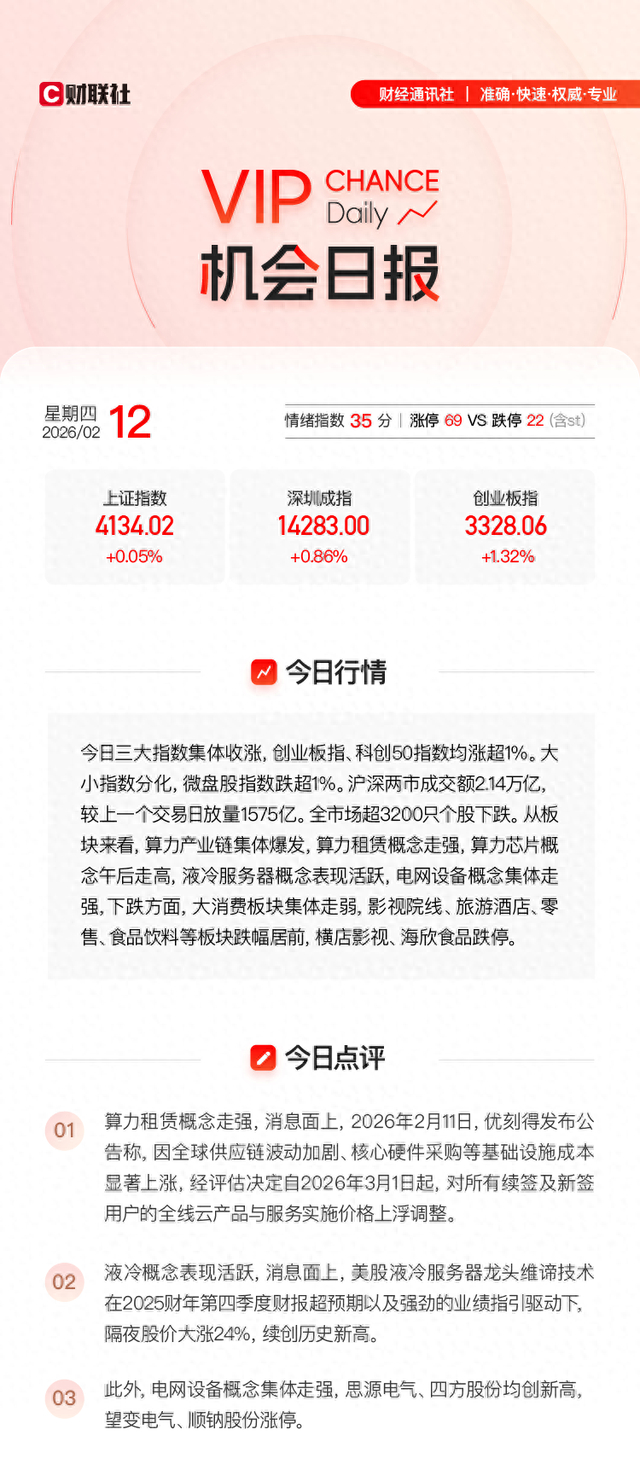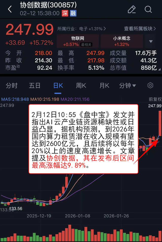2月12日10:55《盘中宝》 发文并指出AI云产业链资源稀缺性或日益凸显,据机构预测,到2026年国内算力租赁潜在收入规模有望达到2600亿元,且后续将以每年20%以上的速度高速增长。文章提及协创数据,其在发布后区间最高涨幅达9.89%。