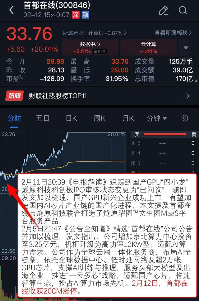 2月12日,首都在线收获20CM涨停。