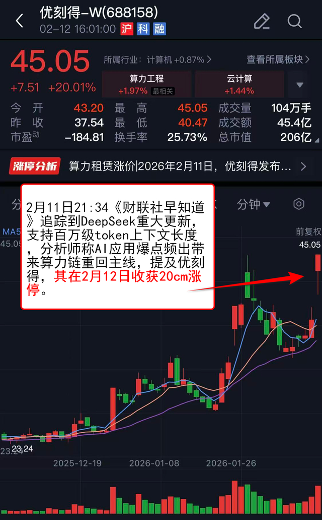 2月11日21:34《财联社早知道》 追踪到DeepSeek重大更新,支持百万级token上下文长度,分析师称AI应用爆点频出带来算力链重回主线,提及优刻得,其在2月12日收获20cm涨停。