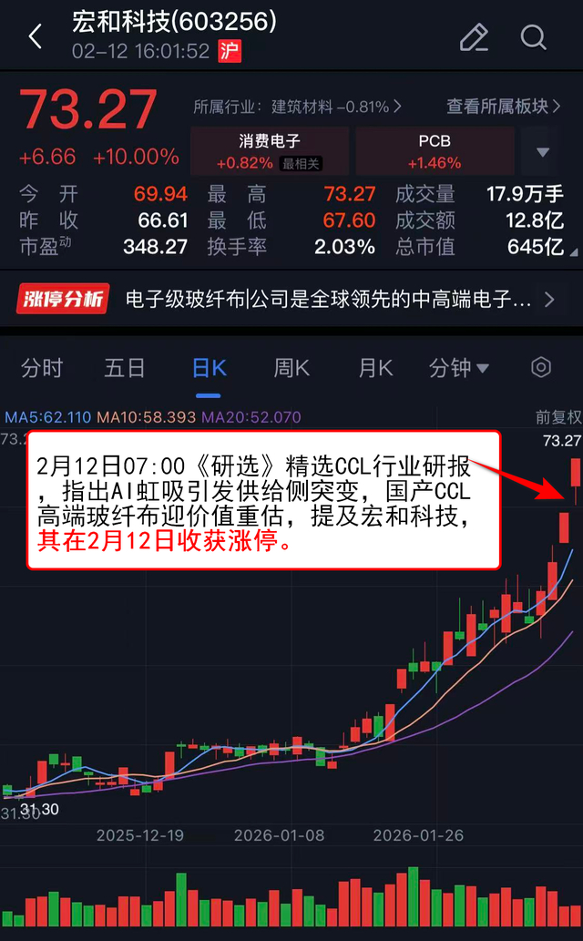 2月12日07:00《研选》 精选CCL行业研报,指出AI虹吸引发供给侧突变,国产CCL高端玻纤布迎价值重估,提及宏和科技,其在2月12日收获涨停。