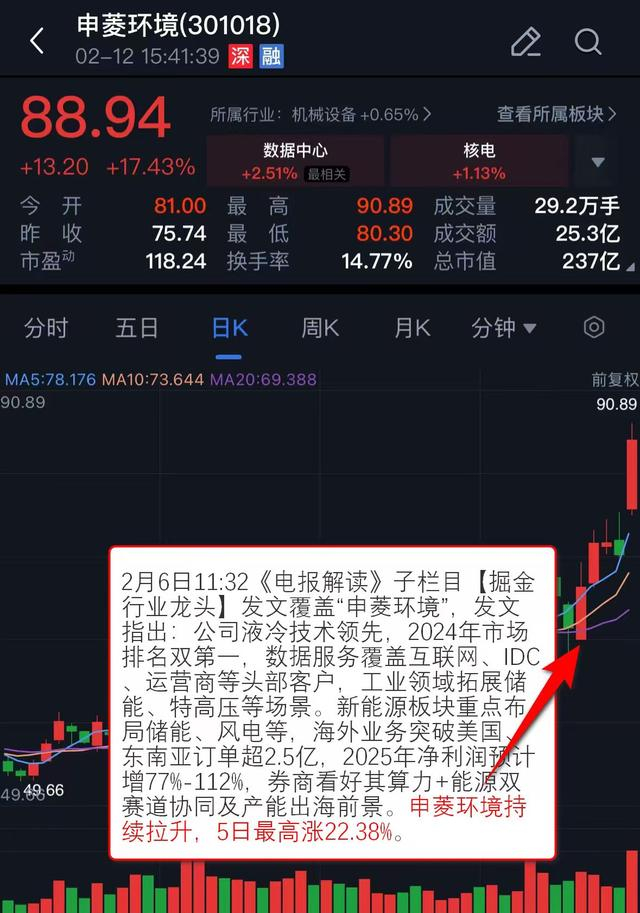2月6日11:32《电报解读》 子栏目【掘金行业龙头】发文覆盖“申菱环境”,发文指出:公司液冷技术领先,2024年市场排名双第一,数据服务覆盖互联网、IDC、运营商等头部客户,工业领域拓展储能、特高压等场景。新能源板块重点布局储能、风电等,海外业务突破美国、东南亚订单超2.5亿,2025年净利润预计增77%-112%,券商看好其算力+能源双赛道协同及产能出海前景。申菱环境持续拉升,5日最高涨22.38%。