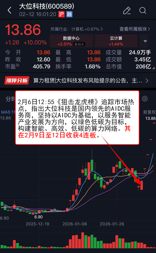 2月6日12:55《狙击龙虎榜》 追踪市场热点,指出大位科技是国内领先的AIDC服务商,坚持以AIDC为基础,以服务智能产业发展为方向,以绿色低碳为目标,构建智能、高效、低碳的算力网络。其在2月9日至12日收获4连板。