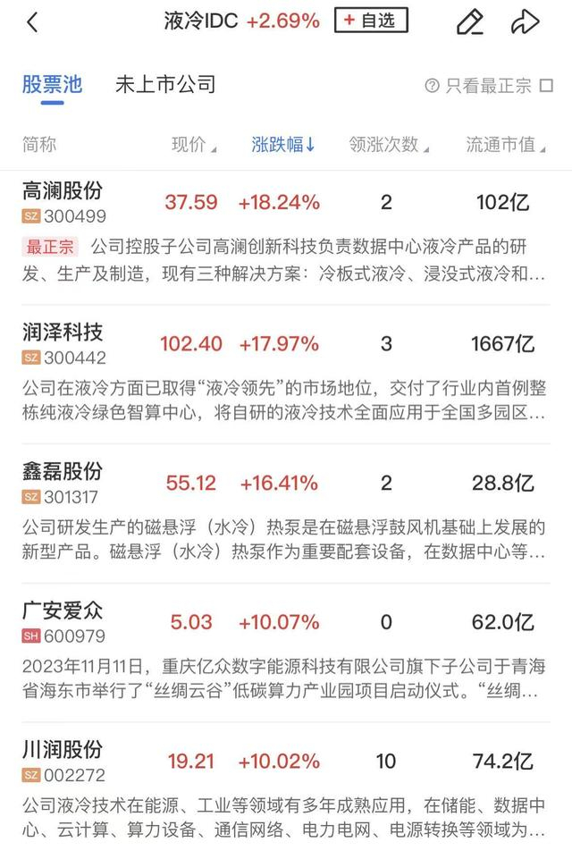 液冷概念同样走强,川润股份、广安爱众、佳力图等涨停,高澜股份、润泽科技、德邦科技涨超10%。