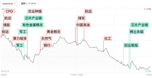 财联社3月3日讯,今日82股涨停,24股炸板,封板率为77%,华盛昌、亚盛集团、和顺石油、水发燃气3连板,金牛化工12天6板,招商轮船8天5板,洲际油气6天4板,中远海能8天4板,北交所科力股份30cm 2连板。三大指数集体收跌,深成指高开低走跌超3%,创业板指跌超2%,沪指盘中突破1月14日的阶段高点后震荡回落。沪深两市成交额3.13万亿,较上一个交易日放量1088亿。全市场超4800只个股下跌。板块方面,石油、天然气、航运、化工板块领涨;半导体、军工、稀土永磁板块跌幅靠前。