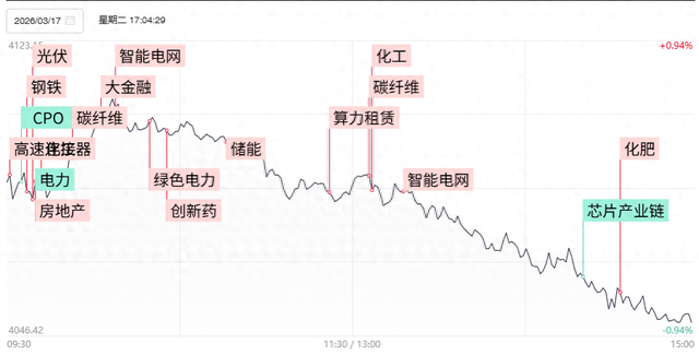财联社3月17日讯,今日39股涨停,17股炸板,封板率为70%,三房巷4连板,法尔胜17天10板,赤天化8天5板,亚翔集成、京投发展、锡华科技3连板,顺钠股份10天6板,卓郎智能10天5板,潞化科技4天3板,中复神鹰20cm 4天2板。市场全天震荡调整,深成指跌超1%,创业板指跌超2%。量能出现萎缩,沪深两市成交额仅2.21万亿,较上一个交易日缩量1175亿。盘面上,市场热点弱势轮动,全市场超4500只个股下跌。板块方面,房地产、保险、证券、白酒板块涨幅靠前;算力硬件、超硬材料、体育、MLED概念板块跌幅靠前。截至收盘,沪指跌0.85%,深成指跌1.87%,创业板指跌2.29%。