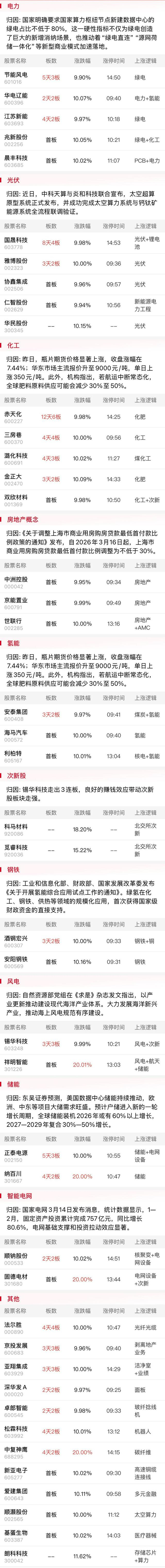 工信部等三部门发布《关于开展氢能综合应用试点工作的通知》,就近利用工业副产氢、可再生能源制氢等清洁低碳氢源,建设低碳冶金装置。受益可再生能源制氢新政,以及此前政府工作报告首次将“算电协同”写入报告内容,绿电概念卷土重来,华电辽能弱转强晋级2连板,节能风电、江苏新能、雅博股份实现反包涨停,绿色动力、浙江新能、华电新能触及涨停。此外受益低碳冶金扶持政策,钢铁板块逆势活跃,安阳钢铁、酒钢宏兴双双反包涨停,中南股份、凌钢股份早盘一度触及涨停。作为当前人气仅次于化工的绿电板块,其同时与储能、算力、氢能等领域的交集,仍容易成为几大方向聚集的一大载体,且板块内抱团人气股仍层出不穷,仍是短线抱团资金绕不开的核心方向之一。而钢铁板块近期的补涨动作,或预示着市场当前的聚焦重点仍集中于低价、超跌两大属性,能否进一步带动整个低价股群体的活跃也值得期待。