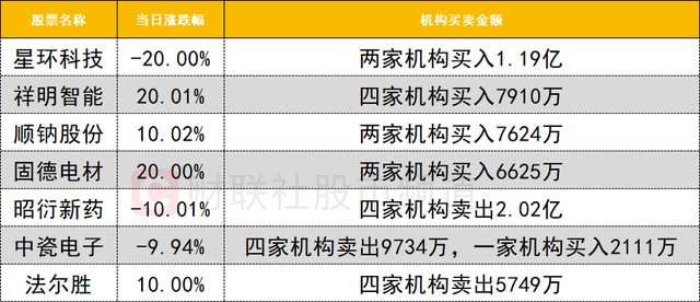 今日龙虎榜机构活跃度明显降低,买入和卖出的个股数量和净买入规模大幅减少。储能概念局部走强,祥明智能20CM涨停,获四家机构买入7910万。CPO概念今日跌幅居前,中瓷电子触及跌停,遭四家机构卖出9734万。