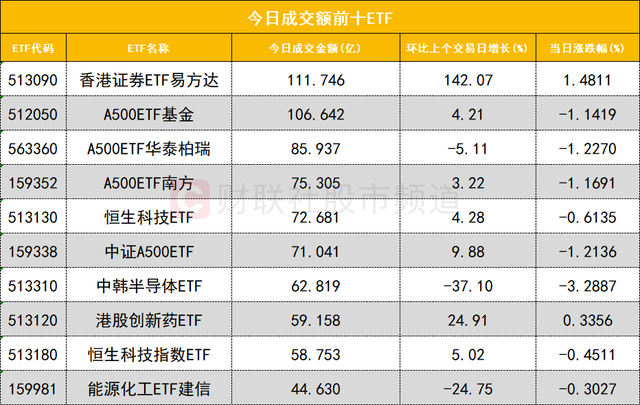 从成交额前十的ETF来看,香港证券ETF易方达(513090)成交额位居首位,A500ETF基金(512050)成交额位居次席。