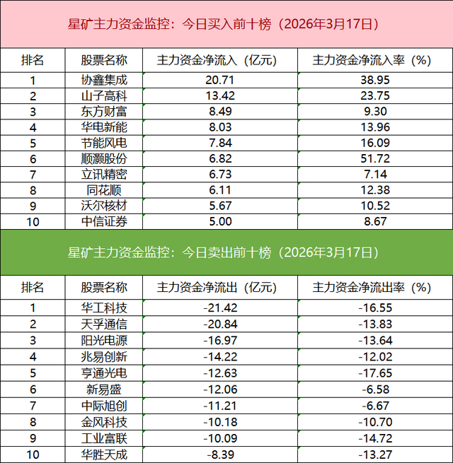 主力资金流出前十的个股所属板块较为分散,华工科技净流出居首。