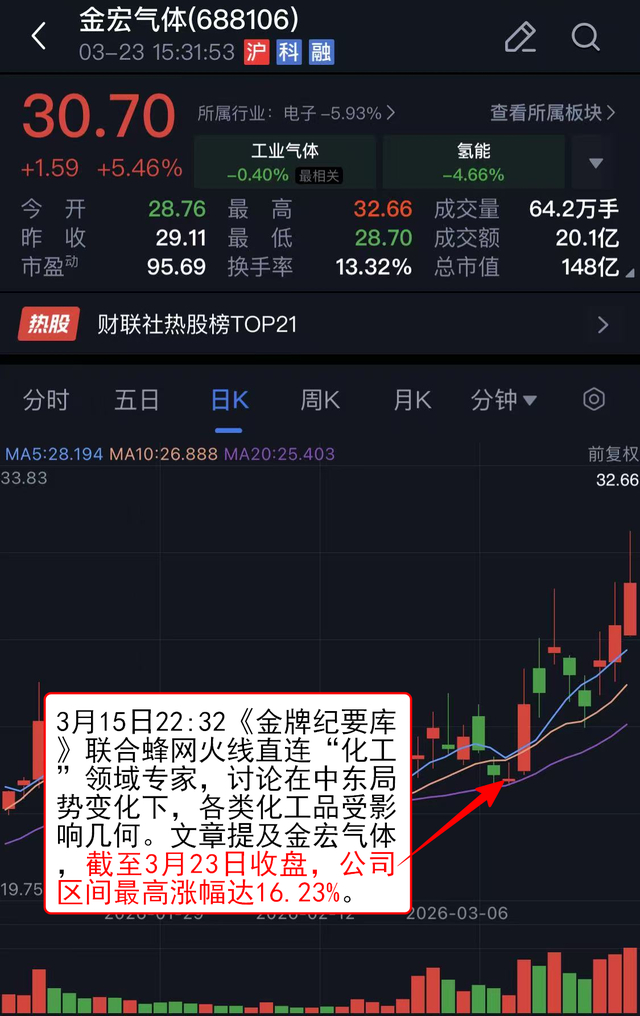 3月15日22:32《金牌纪要库》联合蜂网火线直连“化工”领域专家,讨论在中东局势变化下,各类化工品受影响几何。文章提及金宏气体,截至3月23日收盘,公司区间最高涨幅达16.23%。