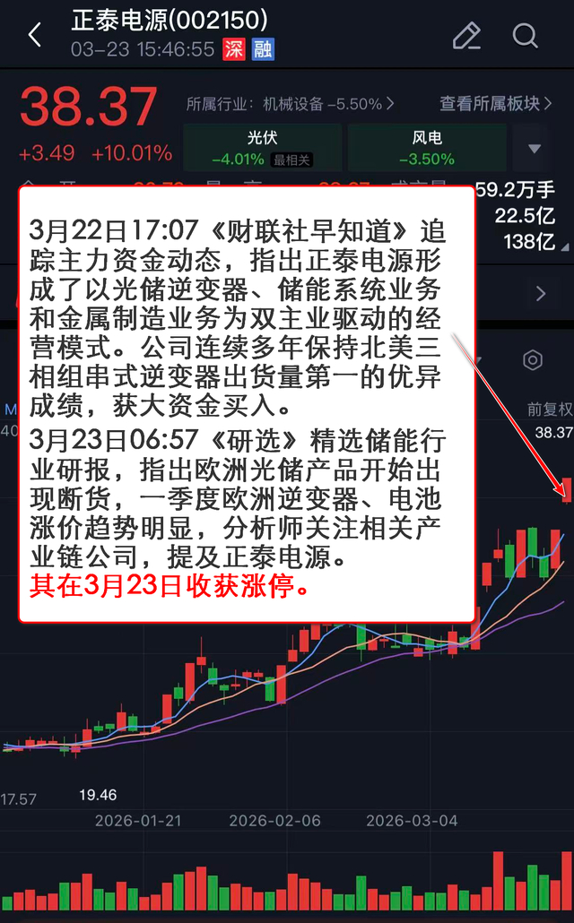 3月22日17:07《财联社早知道》 追踪主力资金动态,指出正泰电源形成了以光储逆变器、储能系统业务和金属制造业务为双主业驱动的经营模式。公司连续多年保持北美三相组串式逆变器出货量第一的优异成绩,获大资金买入。