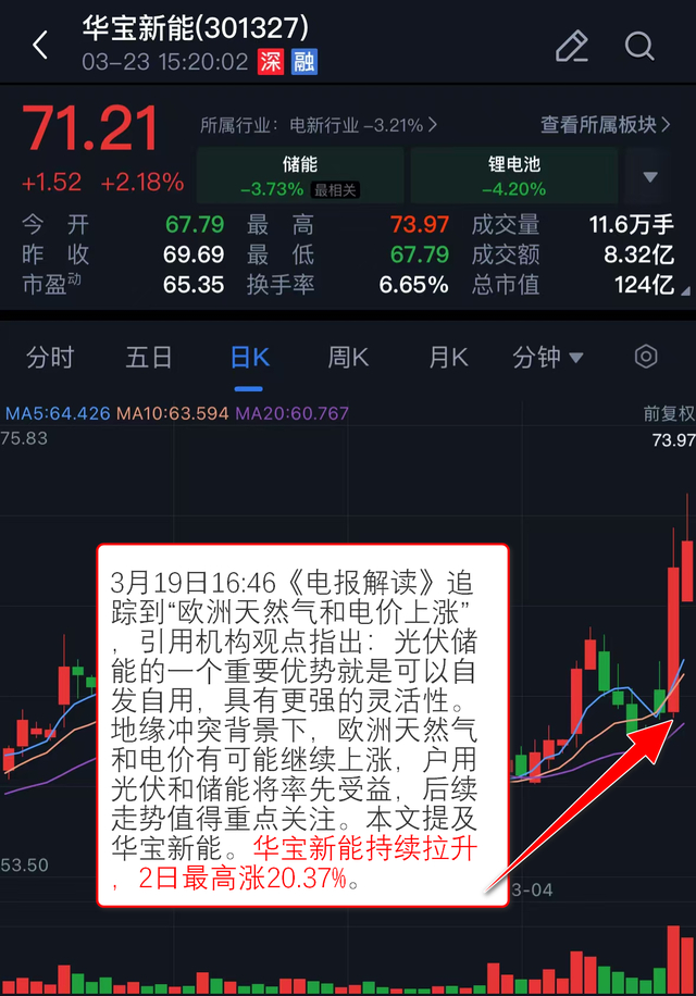 3月19日16:46《电报解读》 追踪到“欧洲天然气和电价上涨”,引用机构观点指出:光伏储能的一个重要优势就是可以自发自用,具有更强的灵活性。地缘冲突背景下,欧洲天然气和电价有可能继续上涨,户用光伏和储能将率先受益,后续走势值得重点关注。本文提及华宝新能。华宝新能持续拉升,2日最高涨20.37%。