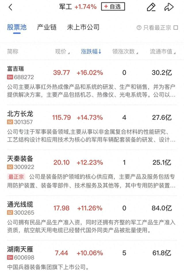 军工板块涨幅居前,建设工业、长城军工等涨停,富吉瑞、北方长龙、内蒙一机、捷强装备等个股涨幅居前。