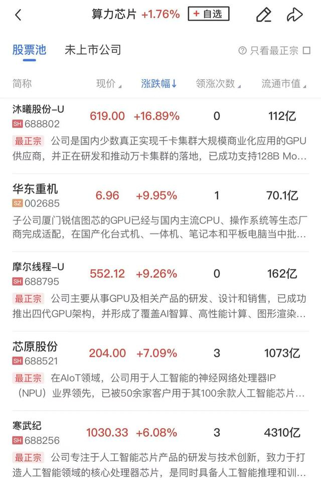 算力芯片概念反弹,沐曦股份涨超15%,摩尔线程涨超9%,芯原股份、寒武纪、金海通、灿芯股份等跟涨。