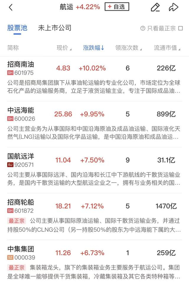 港口航运震荡走强,招商南油、中远海能涨停,国航远洋、招商轮船、宁波海运、海航科技等个股涨幅居前。