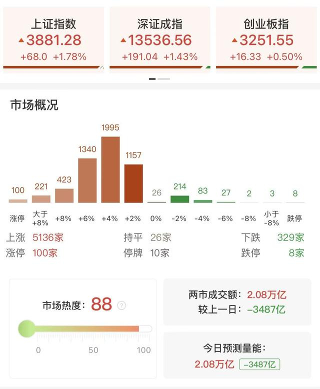 财联社3月24日讯,市场全天探底回升,沪指、深成指均涨超1%,创业板指尾盘翻红,此前一度跌近2.5%。黄白线分化明显,微盘股指数大涨超5%。沪深两市成交额2.08万亿,较上一个交易日缩量3487亿。盘面上,市场热点快速轮动,全市场超5100只个股上涨,其中100只个股涨停。从板块来看,电力板块爆发,十余只成分股涨停,华电辽能7连板,韶能股份5天4板,辽宁能源2连板,华银电力、金开新能、迪森股份涨停。军工板块走强,长城军工、湖南天雁、建设工业涨停。光纤概念午后持续走高,长飞光纤、通鼎互联涨停。航运板块震荡拉升,招商南油涨停。下跌方面,油气股表现较弱,科力股份、通源石油、洲际油气均跌超5%。截至收盘,沪指涨1.78%,深成指涨1.43%,创业板指涨0.5%。