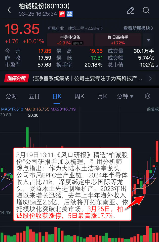 3月19日13:11《风口研报》 精选“柏诚股份”公司研报并加以梳理,引用分析师观点指出:作为大陆本土洁净室龙头,公司布局EPFC全产业链,2024年半导体收入占比71%,深度绑定中芯国际等龙头,受益本土先进制程扩产。2023年出海以来增长迅猛,去年上半年海外收入增635%至2.6亿,后续将开拓东南亚、依托模块化突破北美市场。3月25日,柏诚股份收获涨停,5日最高涨17.7%。