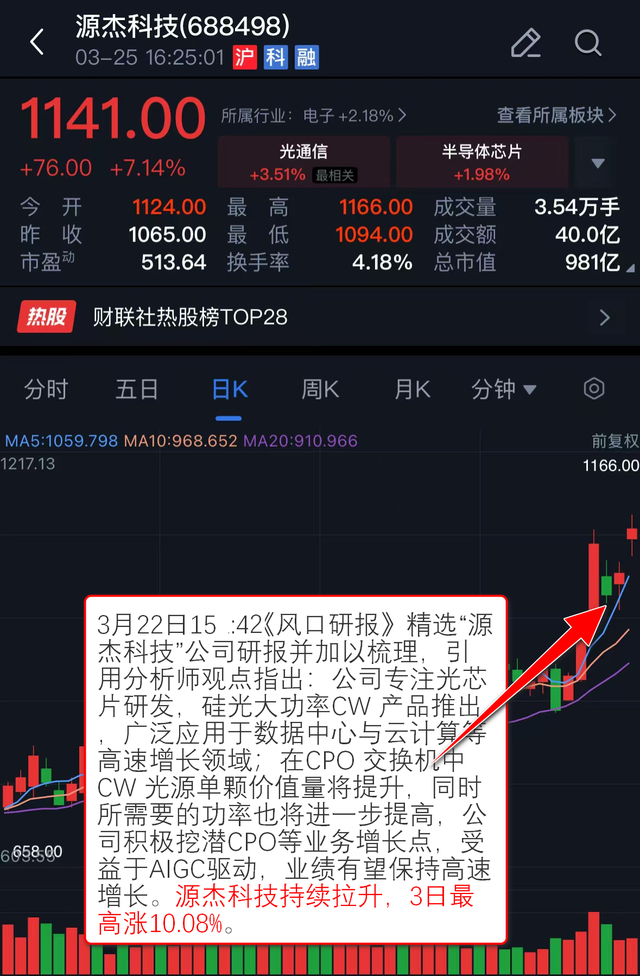 3月22日15:42《风口研报》 精选“源杰科技”公司研报并加以梳理,引用分析师观点指出:公司专注光芯片研发,硅光大功率CW 产品推出,广泛应用于数据中心与云计算等高速增长领域;在CPO 交换机中CW 光源单颗价值量将提升,同时所需要的功率也将进一步提高,公司积极挖潜CPO等业务增长点,受益于AIGC驱动,业绩有望保持高速增长。源杰科技持续拉升,3日最高涨10.08%。