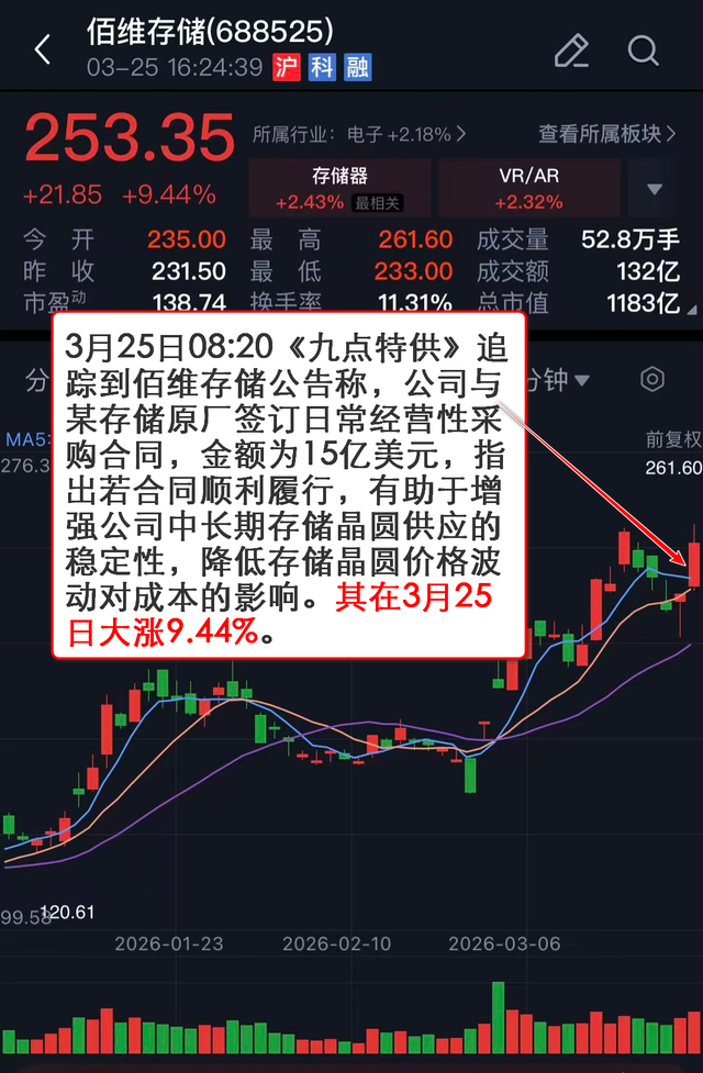3月25日08:20《九点特供》 追踪到佰维存储公告称,公司与某存储原厂签订日常经营性采购合同,金额为15亿美元,指出若合同顺利履行,有助于增强公司中长期存储晶圆供应的稳定性,降低存储晶圆价格波动对成本的影响。其在3月25日大涨9.44%。