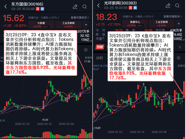 3月25日09:23《盘中宝》 发布文章并引用分析师观点指出:Tokens消耗数量持续攀升;AI算力瓶颈短期仍将持续。AI时代算力和Tokens的需求持续上涨或将使云服务商及相关上下游企业获益。文章提及光环新网和东方国信,截至收盘,其中东方国信收涨8.93%,光环新网收涨17.76%。