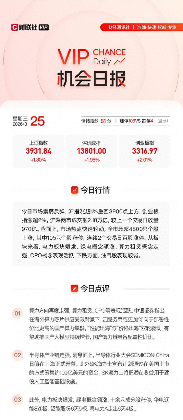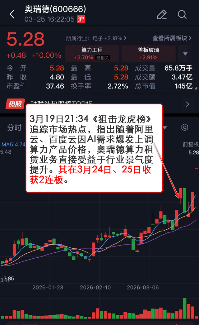 3月19日21:34《狙击龙虎榜》 追踪市场热点,指出随着阿里云、百度云因AI需求爆发上调算力产品价格,奥瑞德算力租赁业务直接受益于行业景气度提升。其在3月24日、25日收获2连板。