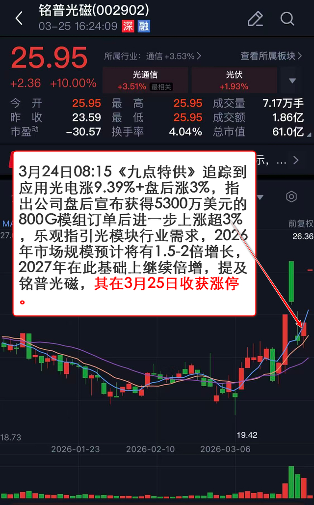 3月24日08:15《九点特供》 追踪到应用光电涨9.39%+盘后涨3%,指出公司盘后宣布获得5300万美元的800G模组订单后进一步上涨超3%,乐观指引光模块行业需求,2026年市场规模预计将有1.5-2倍增长,2027年在此基础上继续倍增,提及铭普光磁,其在3月25日收获涨停。
