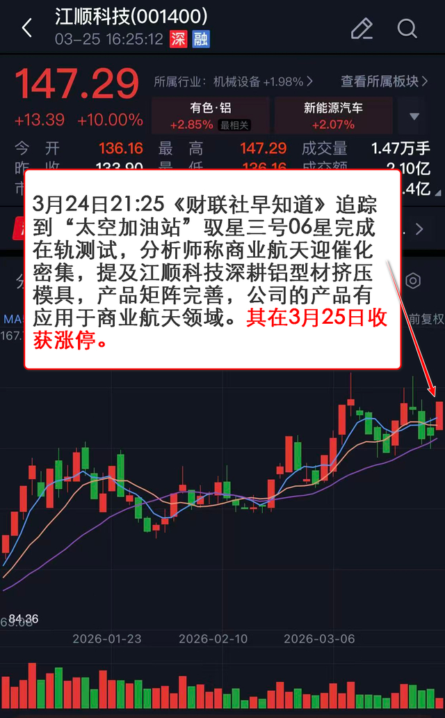 3月24日21:25《财联社早知道》 ,分析师称商业航天迎催化密集,提及江顺科技深耕铝型材挤压模具,产品矩阵完善,公司的产品有应用于商业航天领域。其在3月25日收获涨停。