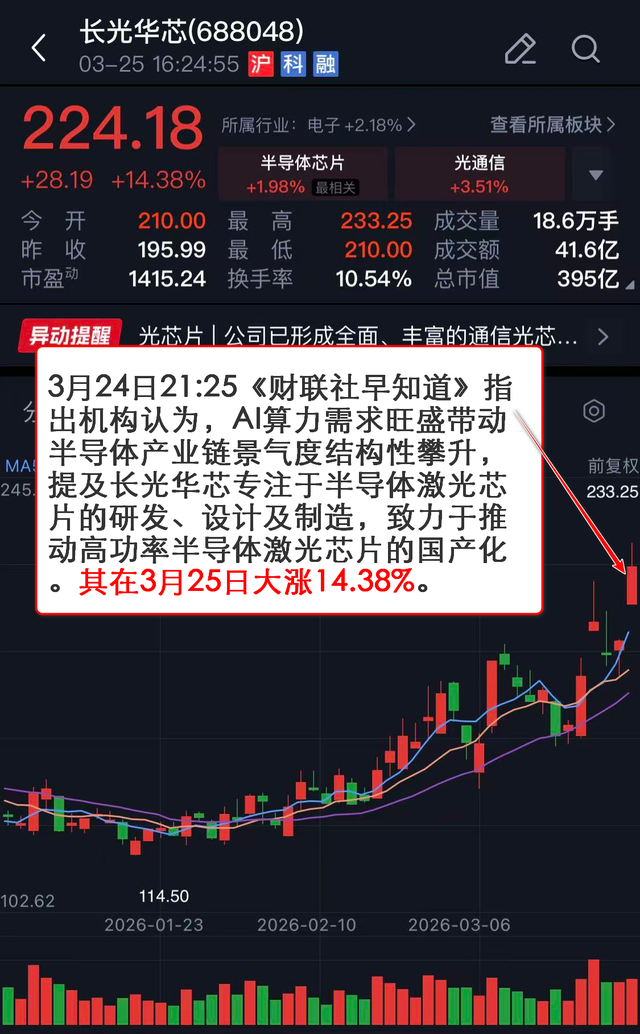 3月24日21:25《财联社早知道》 指出机构认为,AI算力需求旺盛带动半导体产业链景气度结构性攀升,提及长光华芯专注于半导体激光芯片的研发、设计及制造,致力于推动高功率半导体激光芯片的国产化。其在3月25日大涨14.38%。