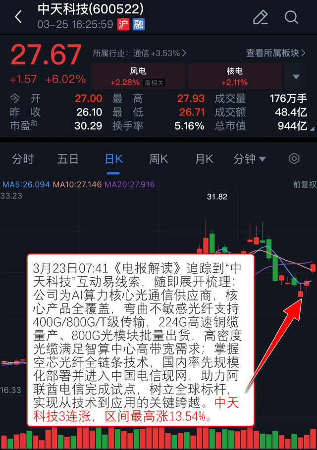 3月23日07:41《电报解读》 追踪到“中天科技”互动易线索,随即展开梳理:公司为AI算力核心光通信供应商,核心产品全覆盖,弯曲不敏感光纤支持400G/800G/T级传输,224G高速铜缆量产、800G光模块批量出货,高密度光缆满足智算中心高带宽需求;掌握空芯光纤全链条技术,国内率先规模化部署并进入中国电信现网,助力阿联酋电信完成试点,树立全球标杆,实现从技术到应用的关键跨越。中天科技3连涨,区间最高涨13.54%。