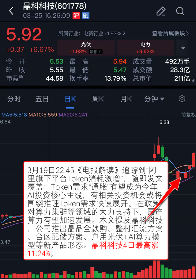 3月19日22:45《电报解读》 追踪到“阿里旗下平台Token消耗激增”,随即发文覆盖:Token需求“通胀”有望成为今年AI投资核心主线,有相关投资机会或将围绕推理Token需求快速展开。在政策对算力集群等领域的大力支持下,国产算力有望加速发展。本文提及晶科科技,公司推出晶品全款购、整村汇流方案、台区配储方案、户用光伏+AI算力模型等新产品形态。晶科科技4日最高涨11.24%。