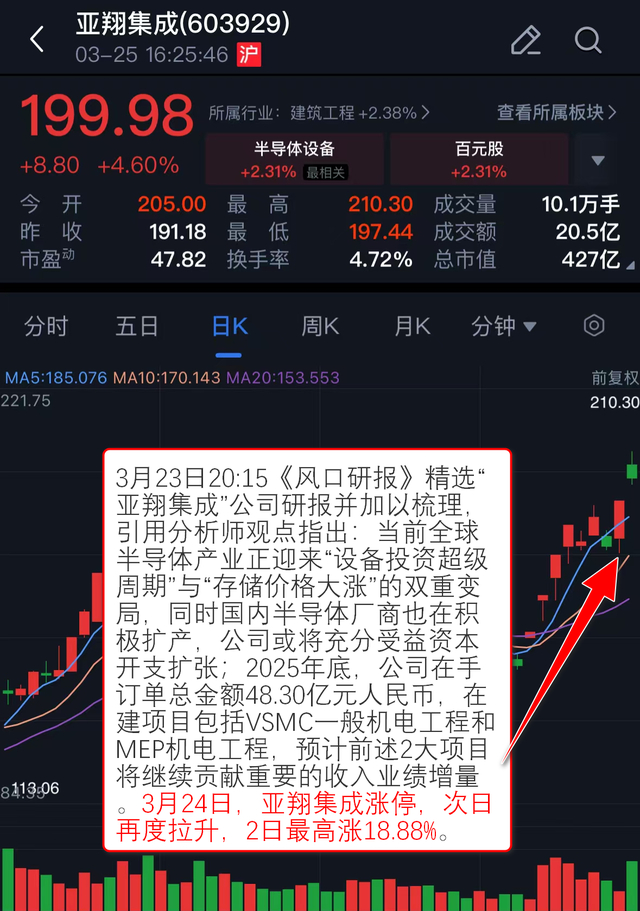 3月23日20:15《风口研报》 精选“亚翔集成”公司研报并加以梳理,引用分析师观点指出:当前全球半导体产业正迎来“设备投资超级周期”与“存储价格大涨”的双重变局,同时国内半导体厂商也在积极扩产,公司或将充分受益资本开支扩张;2025年底,公司在手订单总金额48.30亿元人民币,在建项目包括VSMC一般机电工程和MEP机电工程,预计前述2大项目将继续贡献重要的收入业绩增量。3月24日,亚翔集成涨停,次日再度拉升,2日最高涨18.88%。