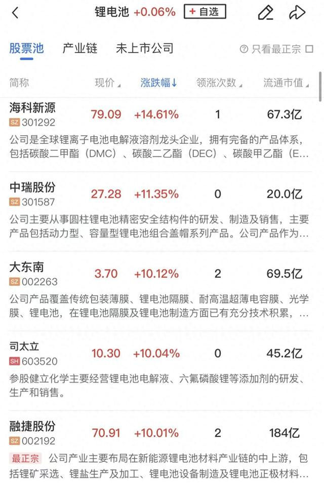 锂电板块涨幅居前,石大胜华涨停,海科新源、中瑞股份涨超10%,华盛锂电、天际股份、璞泰来等个股涨幅居前。