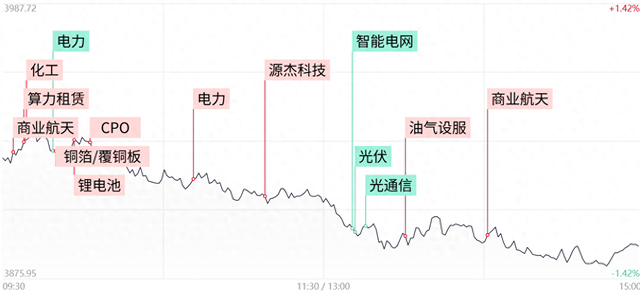 财联社3月26日讯,市场震荡调整,三大指数冲高回落跌超1%,科创50指数跌超2%。沪深两市成交额跌破2万亿,较上一个交易日缩量2362亿。盘面上,市场热点弱势轮动,全市场超4400只个股下跌。从板块来看,电力板块表现活跃,华电能源6天4板,湖南发展3连板,晋控电力、广西能源、深南电A涨停。锂电材料股反复走强,融捷股份3连板,石大胜华、大东南涨停。商业航天概念局部拉升,神剑股份、中超控股、西部材料、再升科技涨停。下跌方面,电网设备概念走弱,顺钠股份跌停,亿能电力、东方电缆、灿能电力大跌。光纤概念震荡下挫,法尔胜跌停。截至收盘,沪指跌1.09%,深成指跌1.41%,创业板指跌1.34%。