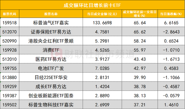 从成交额环比增长前十的ETF来看,标普油气ETF嘉实(159518)成交额环比增长65%位居首位;证券保险ETF易方达(512070)成交额环比增长65%位居次席。