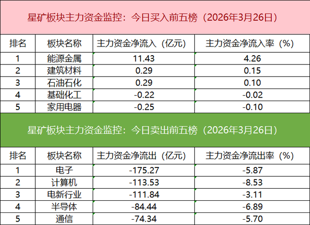 板块资金流出方面,电子板块主力资金净流出居首。