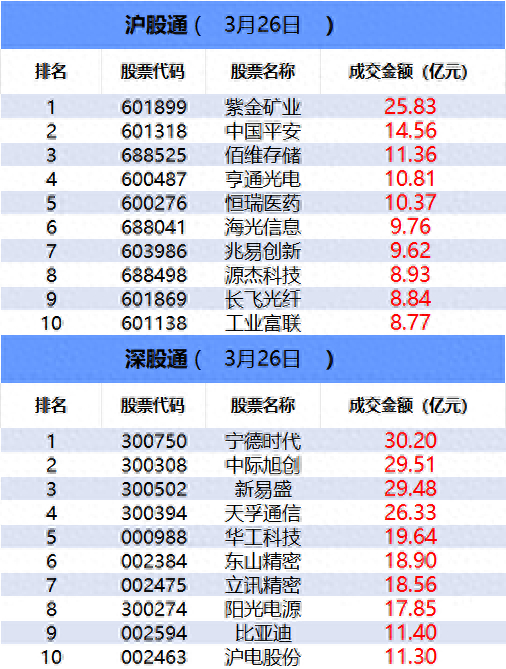 从沪股通前十大成交个股来看,紫金矿业位居首位;中国平安和佰维存储分居二、三位。