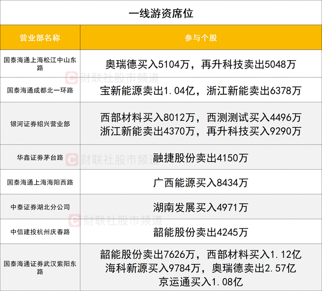 一线游资活跃度较高,商业航天人气股西部材料强势涨停,获两家游资(国泰海通证券武汉紫阳东路、银河证券绍兴营业部)合计买入1.92亿。