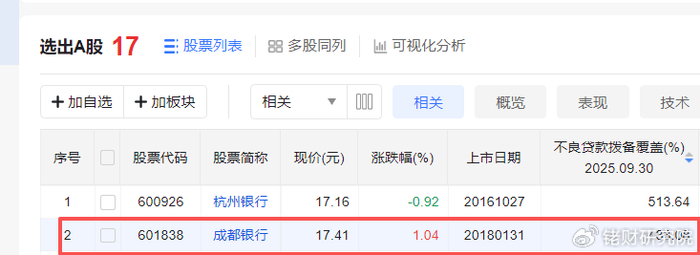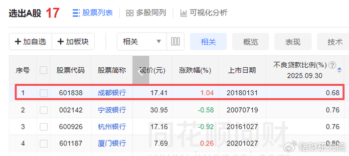 据财报,截至2025年9月末公司总资产1.39万亿元,不良贷款率仅0.68%,拨备覆盖率则高达433.08%。根据同花顺,在17家上市城商行中,两数据分居第一第二位。2025年前三季营收177.61亿元,同比增长3.01%;归母净利94.93亿元,同比增长5.03%。规模质量速度兼具,露出较浓郁的白马底色。
