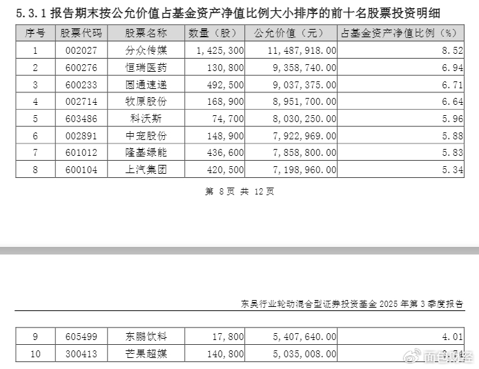 今年以来,该基金的前十大重仓股变更较多。2025年三季度末,基金重仓股包括分众传媒、恒瑞医药、圆通速递等企业。四季度以来,截至2025年12月16日收盘,重仓股中的芒果超媒、科沃斯等股价表现较弱,跌幅超过20%。
