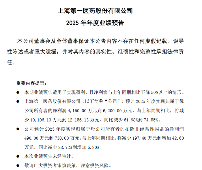 公告显示,第一医药预计2025年度实现归属于母公司所有者的净利润4,150万元到6,200万元,与上年同期相比,将减少10,106.13万元到12,156.13万元,同比减少61.98%到74.55%。
