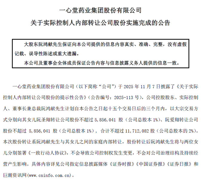 2025年12月,一心堂曾公告实际控制人内部转让公司股份实施完成。