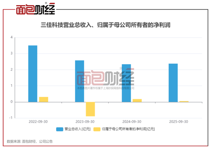 2025年前三季度,三佳科技实现营业总收入2.38亿元,同比增长1.60%;归母净利润为506.09万元,同比下降71.67%;扣非归母净利润328.72万元,同比下降60.42%。