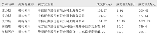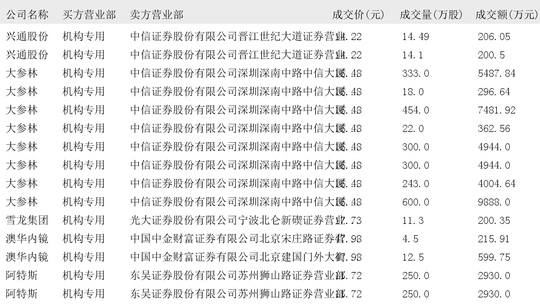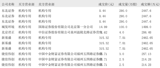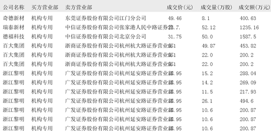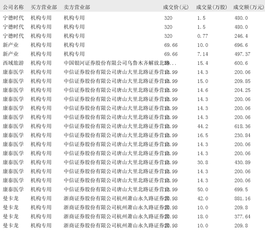 今日大宗交易榜单中出现机构买入席位的个股为:东北证券、城发环境、北京君正、新易盛、捷佳伟创、宁德时代、新产业、西域旅游、康泰医学、曼卡龙、奇德新材、瑞泰新材、德福科技、百大集团、浙江黎明、兴通股份、大参林、雪龙集团、澳华内镜、阿特斯、艾力斯、安杰思、奥精医疗。
