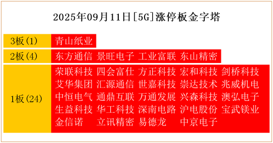 一共有29支个股涨停。其中,青山纸业3板;东方通信、景旺电子、工业富联、东山精密2板;荣联科技、四会富仕、方正科技、宏和科技、剑桥科技、艾华集团、汇源通信、世嘉科技、崇达技术、兆威机电、中恒电气、通鼎互联、万通发展、兴森科技、澳弘电子、生益科技、华工科技、深南电路、沪电股份、宝武镁业、金信诺、立讯精密、易德龙、中京电子1板。