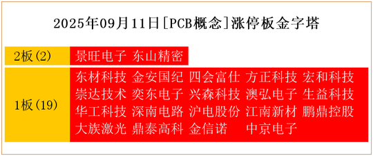 一共有21支个股涨停。其中,景旺电子、东山精密2板;东材科技、金安国纪、四会富仕、方正科技、宏和科技、崇达技术、奕东电子、兴森科技、澳弘电子、生益科技、华工科技、深南电路、沪电股份、江南新材、鹏鼎控股、大族激光、鼎泰高科、金信诺、中京电子1板。