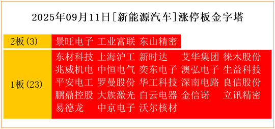 一共有26支个股涨停。其中,景旺电子、工业富联、东山精密2板;东材科技、上海沪工、新时达、艾华集团、徕木股份、兆威机电、中恒电气、奕东电子、澳弘电子、生益科技、平安电工、罗曼股份、华工科技、深南电路、良信股份、鹏鼎控股、大族激光、白云电器、金信诺、立讯精密、易德龙、中京电子、沃尔核材1板。