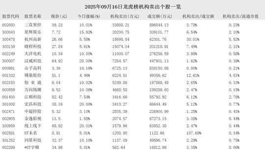 2025年09月16日盘后龙虎榜公开信息中,有37支股票出现了机构的身影。其中,有19支股票出现了机构买入,18支股票出现了机构卖出。